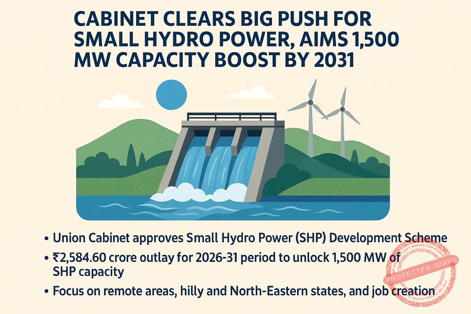 In a major step to strengthen India’s clean energy backbone, the Union Cabinet has approved the Small Hydro Power (SHP) Development Scheme for the period 2026–27 to 2030–31, with a total outlay of Rs 2,584.60 crore. The move is expected to unlock around 1,500 MW of new small hydro capacity, improve electricity access in remote areas, and create large-scale employment—especially in hilly and North-Eastern states.
