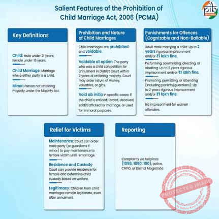 Under the Prohibition of Child Marriage Act (PCMA), 2006, the minimum legal age of marriage remains 18 for women and 21 for men. Any marriage below this threshold is a punishable offence. Legal provisions have been strengthened further where under the Bharatiya Nyaya Sanhita (BNS), 2023, any sexual act with a wife under 18 is classified as rape besides the Supreme Court has ruled that such acts amount to aggravated penetrative sexual assault under the POCSO Act, 2012, carrying severe penalties.